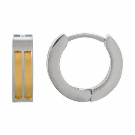 Ces créoles articulées masculines nommées Tilos combinent l'acier argenté à deux bandes centrales jaunes.