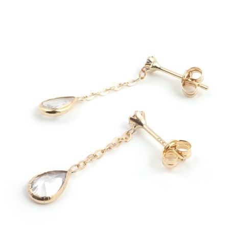 Votre bijouterie Carador vous propose cette paire de boucles d'oreilles pendantes en or 375/000, en forme de poire avec son oxyde de zirconium au centre. Très légères, ses boucles d'oreilles se portent en toutes occasions.