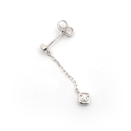 C'est avec un savoir-faire centenaire que la bijouterie CARADOR vous propose une gamme de bijoux de grande qualitée. Ici ce bijou en or blanc 750/000 se compose d'une chaine maille forçat de 1.5 cm avec à son bout un diamant serti 4 griffes. Le haut de la boucle d'oreille se compose également d'un diamant donnant ainsi un sublime éclat à ce bijou. Longueur totale du bijou : 2 cm Fermoir poussette belge