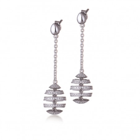 Une chainette maille forçat soutient un pendentif de forme ovoïde en spirale aux bandes serties d’oxyde de zirconium tournant sur leur axe.