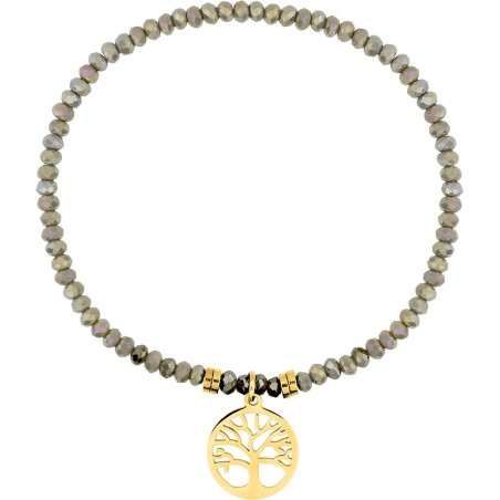 Bracelet Amporelle élastiqué en acier doré avec cristaux gris et breloque arbre de vie