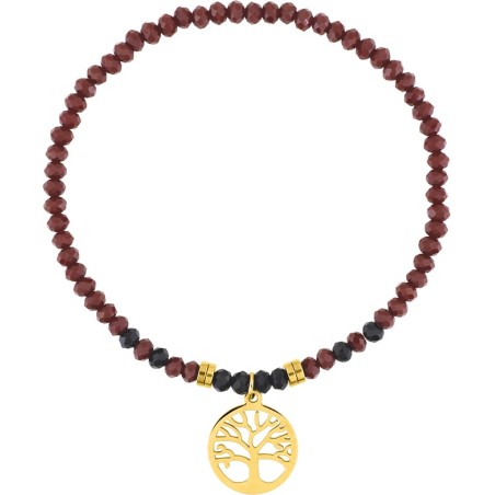 Bracelet Amporelle élastiqué en acier doré avec cristaux rouges et breloque arbre de vie