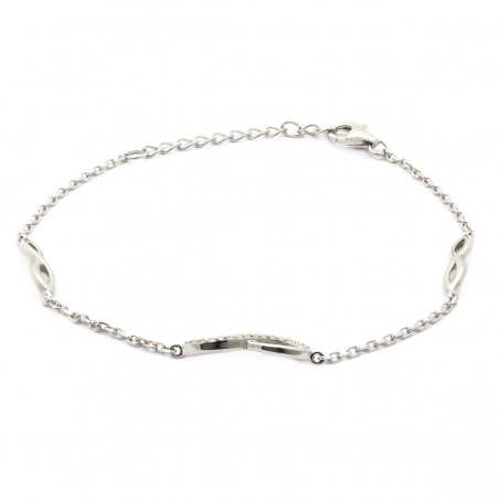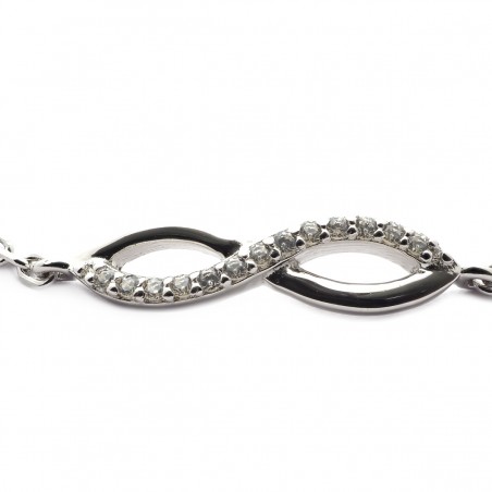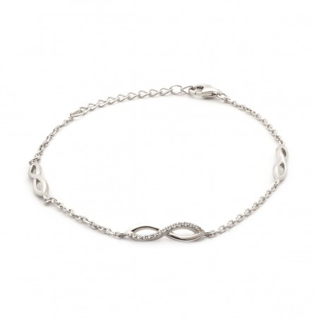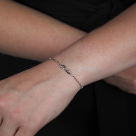 Le bracelet se distingue par ses motifs infini, ornés d'oxydes de zirconium. Ces cristaux blancs apportent une touche scintillante qui illuminera votre poignet et soulignera votre charme. Le bracelet est aussi pratique qu'esthétique, grâce à son fermoir mousqueton et ses deux anneaux intermédiaires qui assurent un ajustement parfait.