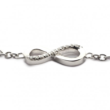 Découvrez le bracelet femme en argent 925/000 proposé par votre bijoutier Carador. Son design chic et délicat s'inspire du symbole infini, conférant à ce bijou une allure résolument tendance. Le motif infini, minutieusement travaillé, est partiellement orné d’oxydes de zirconium. Ces pierres incolores ajoutent un éclat brillant à l'ensemble, captant la lumière à chaque mouvement de votre poignet.