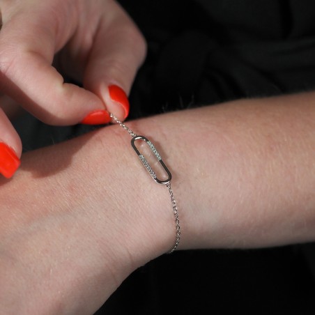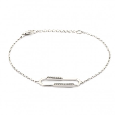 Ce bijou se distingue par son motif unique en forme de maillon rectangulaire, partiellement orné de cristaux d’oxydes de zirconium. Ces pierres blanches ajoutent une brillance discrète qui attire l'œil sans être ostentatoire. Le maillon rectangulaire offre une texture intéressante qui contraste avec le métal lisse de la chaîne.