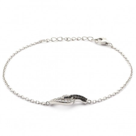 Le véritable attrait de ce bracelet réside dans ses deux gouttes d'eau entrelacées, ornées d’oxydes de zirconium noirs et blancs. Ces cristaux apportent une touche d'éclat et de sophistication à l'ensemble, capturant la lumière à chaque mouvement de votre main. La couleur argentée de la matière contraste subtilement avec la pierre noire, créant ainsi un jeu de nuances raffiné.
