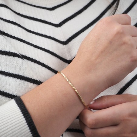 Ce bracelet Carador est conçu pour faire ressortir votre éclat naturel. Le contraste entre le métal doré et le design de la maille palmier donne une dimension unique à ce bijou. Sa forme élégante et sa brillance discrète font de ce bracelet un accessoire incontournable pour toute femme à la recherche d'un bijou délicat et raffiné.