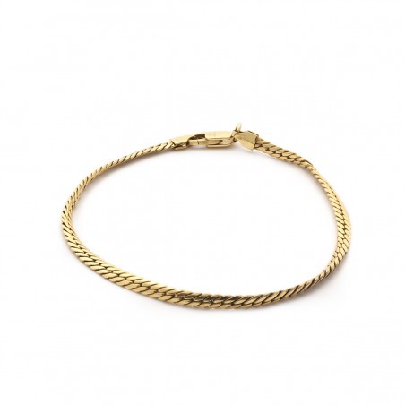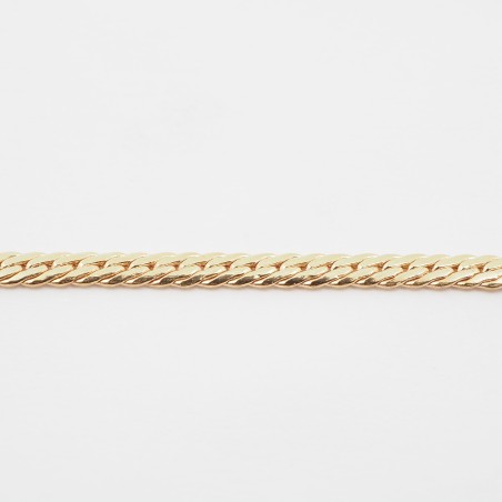Ce bracelet, sans pierre ni ornement, se distingue par son design sobre et raffiné. Sa maille anglaise, évoquant la forme du haricot, offre un effet fin et délicat une fois porté. L'or 9 carats utilisé dans sa conception témoigne de la qualité et du savoir-faire du bijoutier Carador.