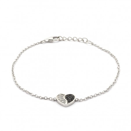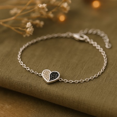 La particularité de ce bracelet se trouve dans son cœur bicolore, d'un côté blanc, de l'autre noir, évoquant l'équilibre du Yin et du Yang. C'est un véritable symbole d'harmonie et d'amour, idéal pour agrémenter vos tenues quotidiennes ou pour les occasions spéciales. Ce bijou, résolument romantique, apporte une touche de fantaisie à votre poignet.