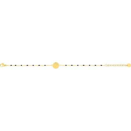 Bracelet Fantaisie Amporelle en acier doré avec perles de verre noires et plaque ronde martelée