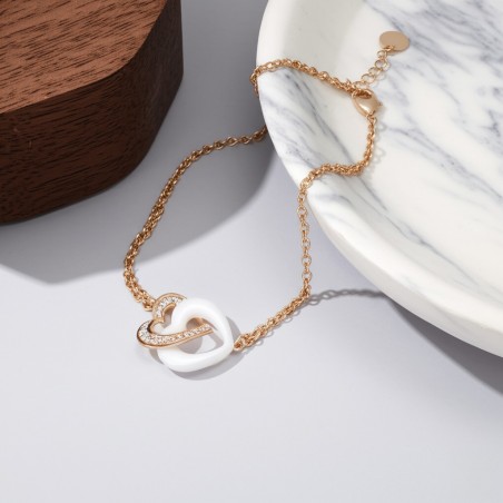 La magnificence de ce bijou ne s'arrête pas là. Les cœurs sont sertis d'oxydes de zirconium, des pierres scintillantes qui rivalisent d'éclat avec le diamant. La céramique blanche, douce et lumineuse, vient compléter ce tableau d'élégance, offrant un contraste raffiné avec le doré du plaqué or.