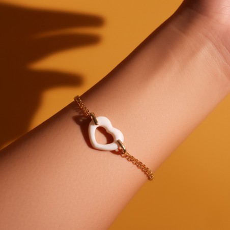 Au centre du bracelet, un motif cœur attire l'œil. Ce détail charmant est entouré d'oxydes de zirconium, ajoutant une note d'éclat et de sophistication. Le bracelet est également agrémenté de céramique blanche, pour une finition soignée et un contraste saisissant avec l'or.