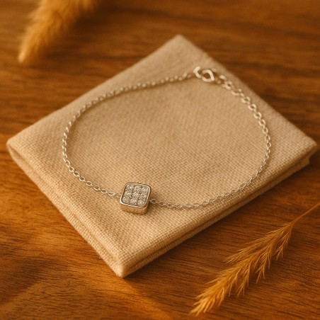 D'une longueur de 18 cm, ce bracelet est conçu pour épouser parfaitement les courbes de votre poignet. Le pendentif carré, de dimensions 6 x 6 mm, est la pièce maîtresse de ce bijou, captant la lumière et reflétant des éclats blancs. Appartenant à la catégorie des bracelets fantaisie, ce bijou se porte au quotidien comme lors d'occasions spéciales.