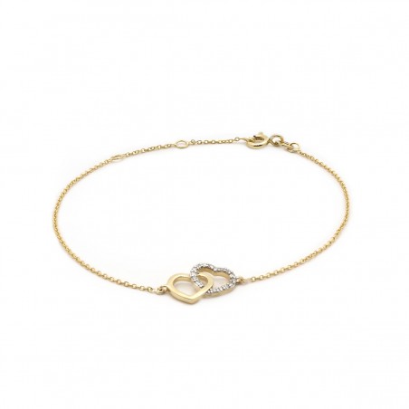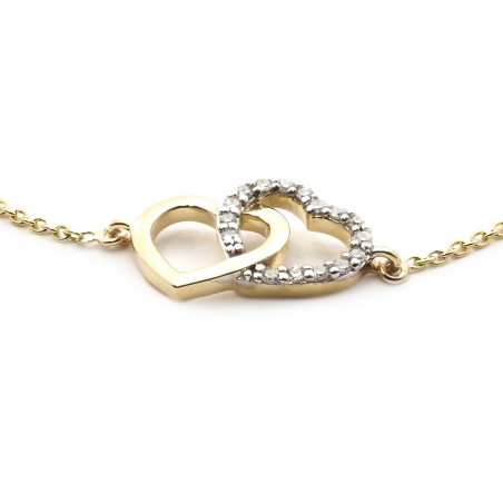 Sa chaîne est de type maille forçat, d'une longueur de 18 cm. L'originalité de ce bijou réside dans ses deux cœurs entrelacés, l'un d'eux étant serti de diamants blancs, symbole d'amour et d'éternité. Ce bracelet fantaisie est donc une belle expression de sensualité et de féminité.