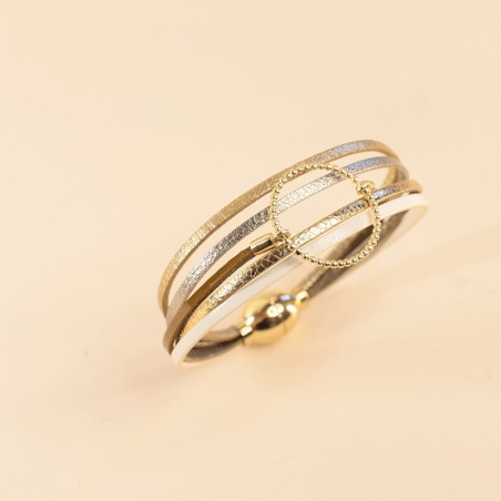 Sa particularité réside dans la présence de deux liens en cuir, ajoutant une touche de sophistication et de caractère à votre tenue. Les trois chaînes dorées qui complètent ce bracelet ajoutent une allure chic et élégante. Les nuances de doré et d'argent s'harmonisent avec la couleur du cuir, pour un rendu visuellement attrayant.