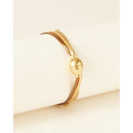 Bracelet Femme Flowers for Zoé Lena en argent doré et cuir doré et marron 18 CM