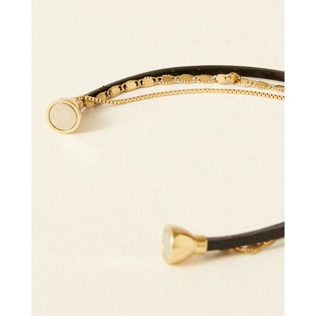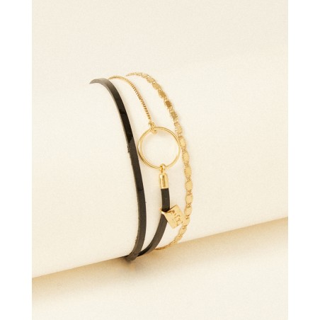 Bracelet Femme Flowers for Zoé TABATHA en argent doré et cuir noir vernis 18 CM