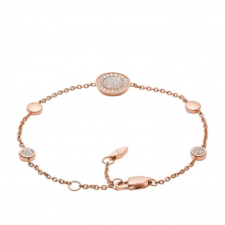 Embarquez dans un voyage vintage avec ce bracelet femme de la collection Classics de Fossil. Disponible chez votre bijouterie Carador, ce bijou allie élégance et sobriété avec une pointe de fantaisie. Fabriqué en acier, il présente une couleur doré rose qui ne manquera pas de rehausser votre poignet de manière subtile. La chaîne du bracelet est ornée de pampilles délicates, embellies par des cristaux éclatants et des paillettes. Avec une longueur de 16 cm, extensible jusqu'à 19 cm grâce à une rallonge de 3 cm, il s'adapte à toutes les tailles de poignet. Les oxydes de zirconium ajoutent une touche de brillance, tandis que les pampilles blanches contrastent joliment avec la teinte doré rose de l'acier. Ce bracelet Fossil, alliant un style fantaisie et une qualité indéniable, est le parfait accessoire pour vous accompagner au quotidien ou lors de vos soirées spéciales.