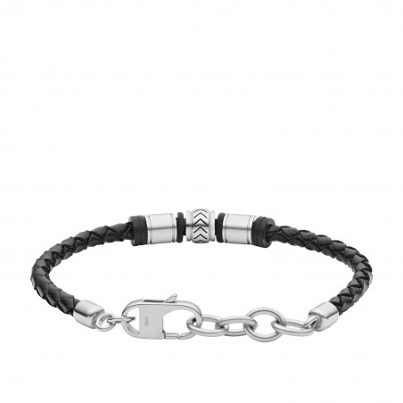 Bracelet Fossil en cuir noir tressé et acier argenté