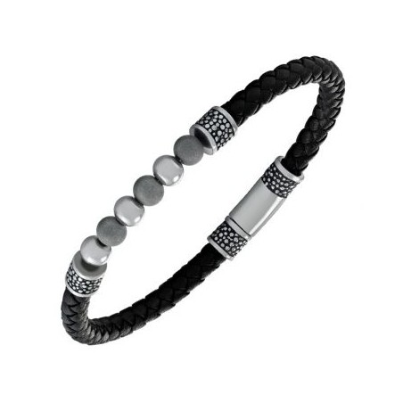 Bracelet Homme Jourdan en Acier bicolore et Cuir noir avec perles