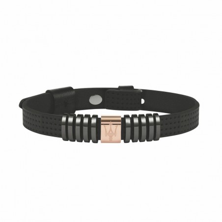 Le motif principal de ce bracelet se distingue par un trident, symbole emblématique de la marque Maserati, gravé sur un acier doré rose. Pour une touche d'élégance supplémentaire, des éléments d'acier noir en forme de fins anneaux sont disposés de part et d'autre du motif. Cette combinaison de textures et de nuances donne vie à une pièce séduisante qui se marie parfaitement à n'importe quel style vestimentaire.
