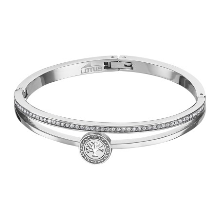 Il se compose de deux joncs rigides en acier argenté dont un possédant le motif arbre de vie et le second orné de pierres incolores.