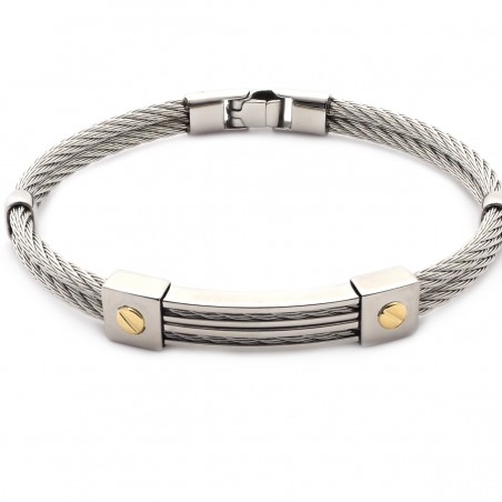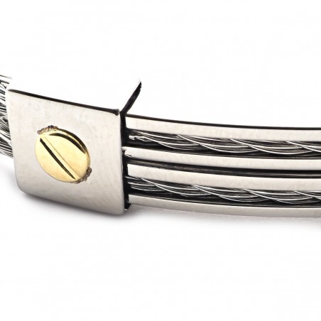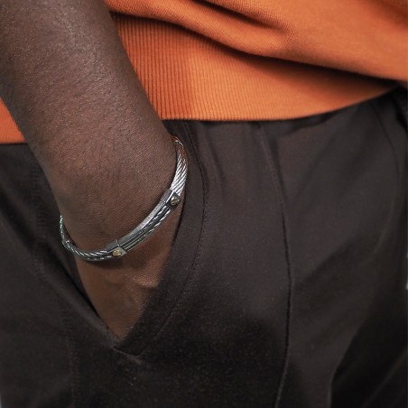 Découvrez le bracelet rigide pour homme proposé par la bijouterie en ligne Carador. Confectionné en acier, ce bijou se distingue par sa robustesse et son allure masculine. Sa conception unique met en valeur deux câbles liés par une plaque en or jaune 750/000, apportant une note vintage à l'ensemble.