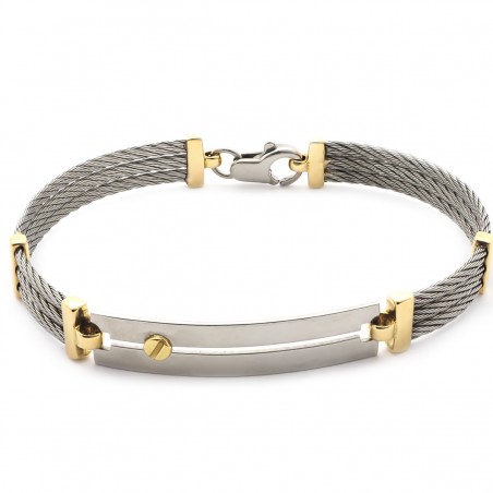 Élégant et raffiné, ce bracelet semi-rigide en acier et or jaune 750/000 pour homme est une création de la bijouterie en ligne Carador. Sa conception associe deux matériaux nobles, l'acier argenté et l'or jaune, et offre un contraste visuellement captivant. Les deux plaques rectangulaires du bracelet sont personnalisables, ce qui donne une touche unique à ce bijou. Avec une longueur de 21 cm, il habille le poignet avec distinction et convient à toutes les circonstances.