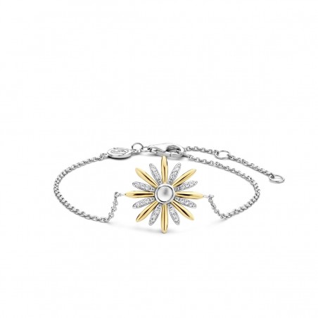 Laissez-vous charmer par ce bracelet pour femme signé Ti Sento, un bijou tendance et original proposé par votre bijoutier Carador. Ce modèle élégant en argent 925/000 rhodié arbore un caractère unique et solaire. Il est composé d'une chaîne maille forçat rehaussée d'un motif de forme de soleil. Le centre du soleil est sublimé par une pierre de nacre, entourée de rayons sertis d'oxyde de zirconium et d'autres revêtus d'une teinte or, apportant une touche bicolore à ce bijou. Ce bracelet fantaisie est l'accessoire idéal pour illuminer votre quotidien avec chic. Sa pierre incolore et son design soigné reflètent le savoir-faire de la marque Ti Sento. À porter seul ou associé à d'autres bijoux, ce bracelet Soleil Femme Ti Sento en Argent est une invitation à la féminité et à l'éclat.