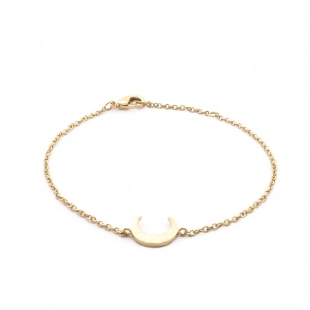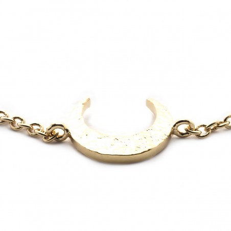 Il se compose d'une fine chaîne maille forçat qui affiche une qualité exceptionnelle. Le motif de croissant de lune martelé, mesurant 9 x 9 mm, ajoute une touche d'originalité et de mystère à ce bijou. Avec une longueur totale de 18 cm, ce bracelet souple convient à la plupart des poignets. Il est dépourvu de pierre, ce qui met en avant la beauté pure du plaqué or.