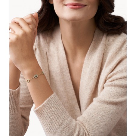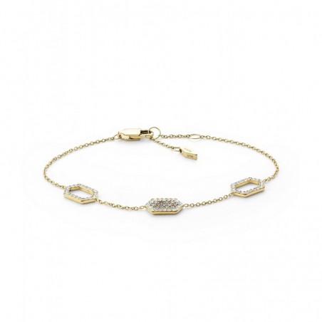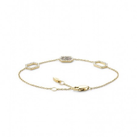 Ce bracelet possède une chaîne maille forçat et des motifs de forme hexagonale en acier doré et strass. Celui du centre accueille également des éléments nacrés.