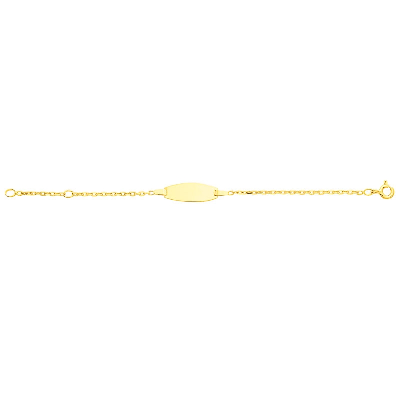 Carador vous propose une gourmette pour bébé en or jaune 375/000. Cette très jolie gourmette est munie d'une plaque à graver ovale montée sur une chaine maille forçat. Le bracelet mesure 13 cm. Ce bijou est le cadeau idéal pour la naissance ou le baptême de votre bébé.