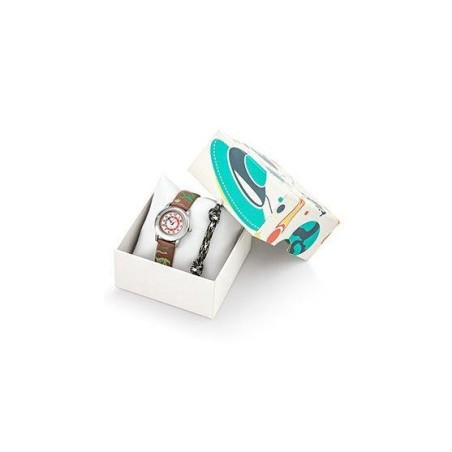 Son cadran blanc abrite deux jeux d'index (heures et minutes) et un mécanisme à trois aiguilles pour un apprentissage et une lecture de l'heure facile. Le bracelet cordon est de couleur blanc, noir et vert.