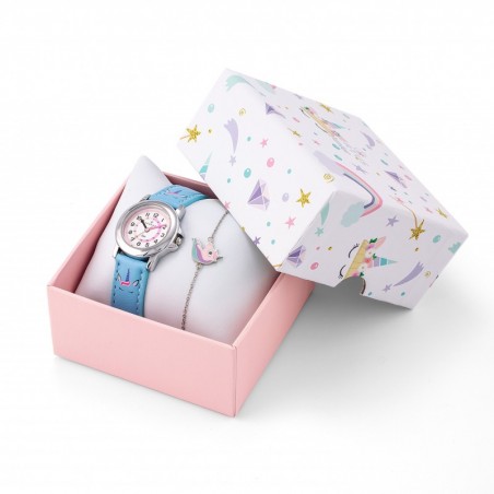 La montre affiche un bracelet en cuir au motif licorne et un boitier couleur argent de 28mm.