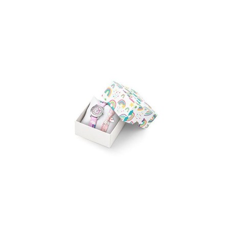 Coffret Montre Certus Junior fille cuir rose motif nuages accompagnée d'un bracelet en tissu rose pampille cœur