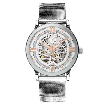 Son cadran blanc met en évidence les aiguilles blanches bordés de doré rose pour une lecture optimale. Ajouré en son centre il vous permet d’apprécier la finesse de son mécanisme automatique.