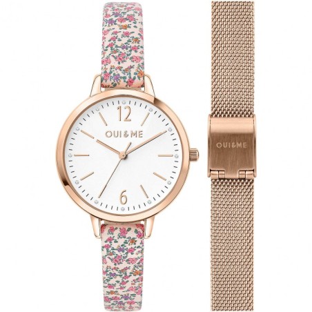 Coffret Montre Oui & Me Fleurette acier doré rose bracelets milanais et cuir fleuri