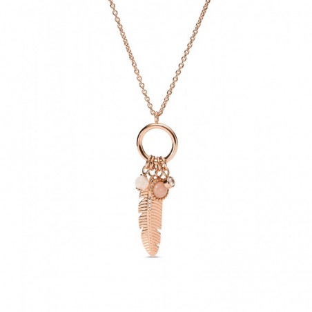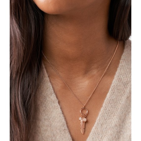 Ce collier est un bijou délicat et élégant avec une petite touche de fantaisie apportée par le pendentif classique en soi : un cercle; mais qui possède plusieurs éléments : billes de quartz rose, de brillant et un motif plume.