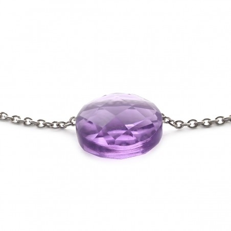 Il est constitué d'une pierre d’améthyste, aux teintes lilas, ronde et facettée rappelant la forme d’un coussin.
