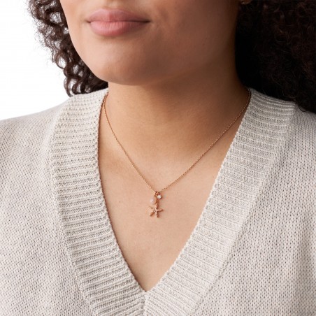 Le collier Beach Girl Fossil JF03519791 est un bijou délicat et élégant avec une petite touche de fantaisie apportée par les trois pendentifs : une pierre de lune de couleur rose, un cristal serti clos et une étoile de mer.