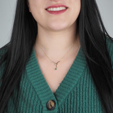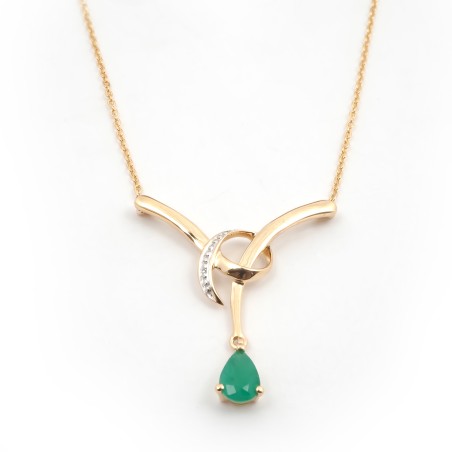 Ce bijou est en or jaune et blanc 9 carats, avec une émeraude, le pendentif très travaillé donne à ce collier une élégance particulière. Un bijou raffiné.