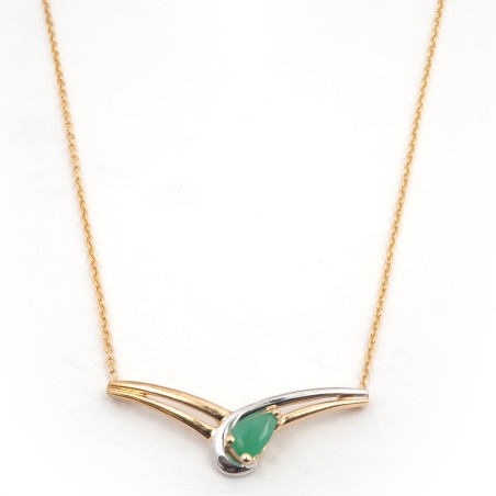 Ce sublime bijou plaira aux femmes qui aiment les bijoux en or et les pierres précieuses comme l'émeraude. Ce collier est en or 9 carats jaune et blanc et une jolie émeraude est incrustée dans le pendentif.