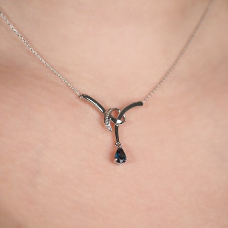 Un bijou très élégant en or blanc 375/000 et un saphir. Pendentif travaillé avec des courbes. Un collier pour les femmes qui aiment les pierres précieuses.