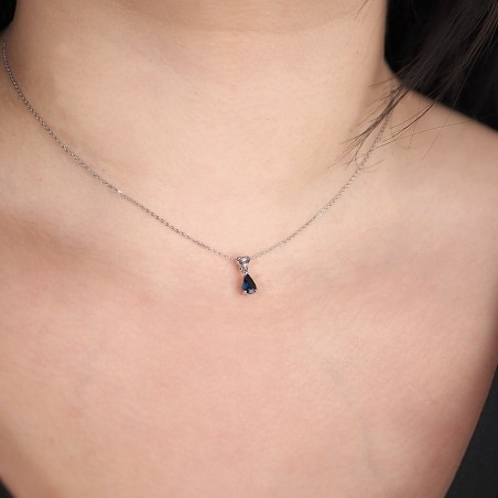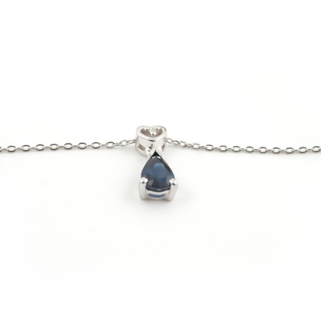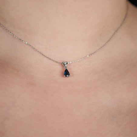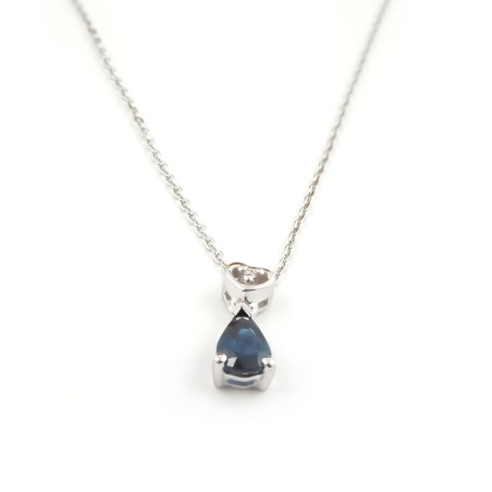 Un joli collier en or blanc 375/000 et son pendentif saphir. Un bijou pour les femmes qui aiment les pierres précieuses.