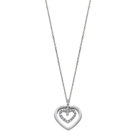Le collier est composé d'une chaîne en acier argenté maille forçat, ainsi que d'un pendentif au motif double cœur dont un orné de pierres incolores.
