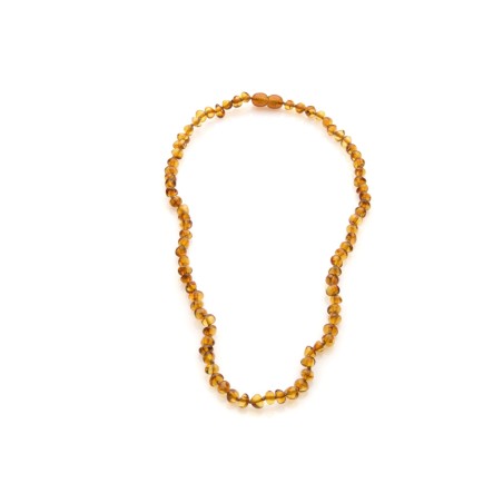 Ce collier couleur argent est constitué de pierres roulées d’ambre couleur cognac.