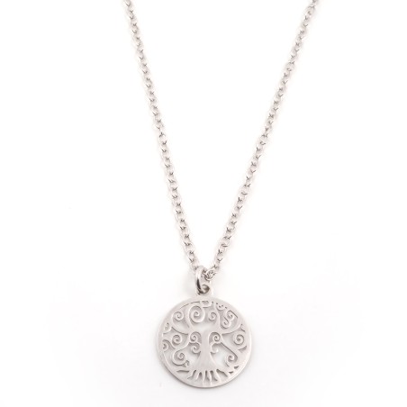 Ce modèle se compose d'une chaine maille forçat de 40 + 3 cm et d'un pendentif rond affichant un arbre de vie.