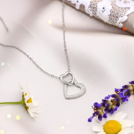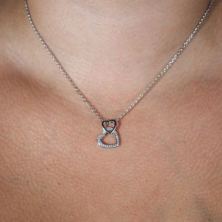 Ce modèle est composé d'une chaine en argent 925/000 maille forçat réhaussé par deux coeurs qui s'entremellent dont un incrusté d'oxyde de zirconium.