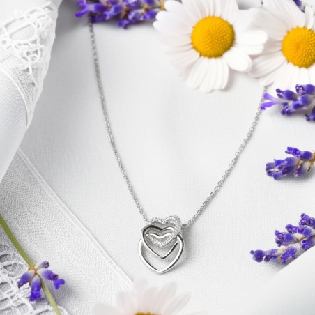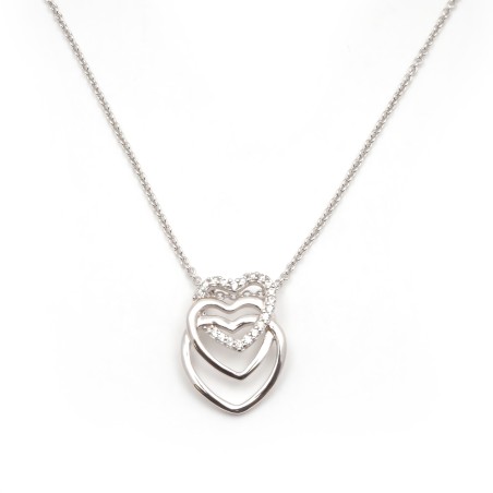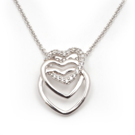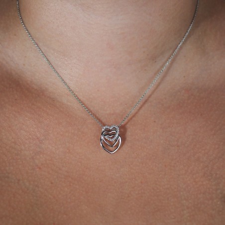 Ce modèle est composé d'une chaine en argent 925/000 maille forçat réhaussé par trois coeurs qui s'entremellent dont un incrusté d'oxyde de zirconium.