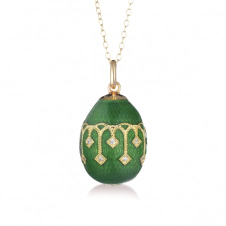 Elle supporte un pendentif de forme ovoïde vert et de magnifiques motifs de type dentelle orné d’oxyde de zirconium.